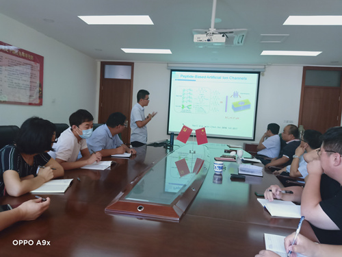 曾飞博士做了题为“Bioinspired Artificial Channels(仿生人工离子通道)”的报告,并与科研人员就人工离子通道的设计合成及其抗癌性能、基于三蝶烯结构共轭聚合物的合成及其性能、基于三蝶烯结构超分子聚合物的设计合成及其性能等问题讨论交流。