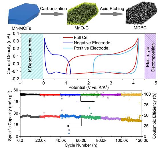 钾离子电容器被认为是一种低成本、高容量的、可替代传统锂离子电容器的新型电容器,但是它的商业化应用受制于其较低的比能量和相对较短的循环寿命。刊发的论文研发了一种基于锰基金属框架化合物衍生多孔炭阳极材料。该材料具有层间膨胀、无定型碳结构且表面富含氧官能团。结构和性能分析证实该材料具有良好储钾性能。以该炭材料作为钾离子电容器的负极,多孔炭作为正极所组装的钾离子电容器能够输出120 Wh/kg的比能量,功率密度可达26 kW/kg,循环寿命达到10万次以上,是目前报道的最高值。