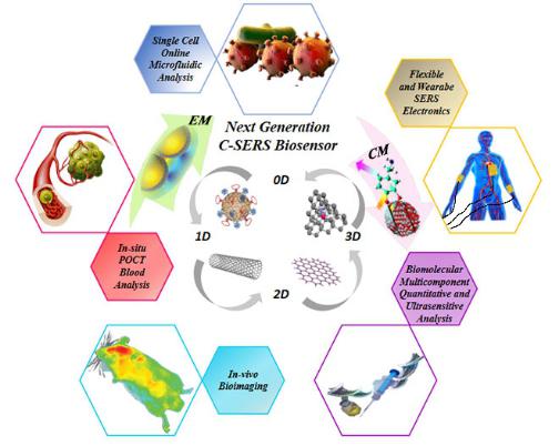 该研究工作基于课题组前期相关研究成果,总结了基于碳纳米材料的SERS生物传感器的研究进展,重点介绍了碳基材料作为SERS生物传感器的可用性、灵敏度、生物相容性、表面功能化方法和设计原则等设计策略、基底制备和增强机理方面的基本原理,利用零维碳量子点(CQD)、一维碳纳米管(CNT)、二维石墨烯(G)、氧化石墨烯(GO)等碳基纳米材料和三维空间碳纳米材料或碳基核壳隔离纳米结构(SHINERS)作为衬底材料是SERS生物传感器设计中发展迅速的一个领域,对其在生物医学和生物工程、原位分析、定量分析和柔性光电功能材料等领域的应用进行了总结,并对碳基SERS生物传感器研究面临的主要挑战和未来机遇进行了展望。