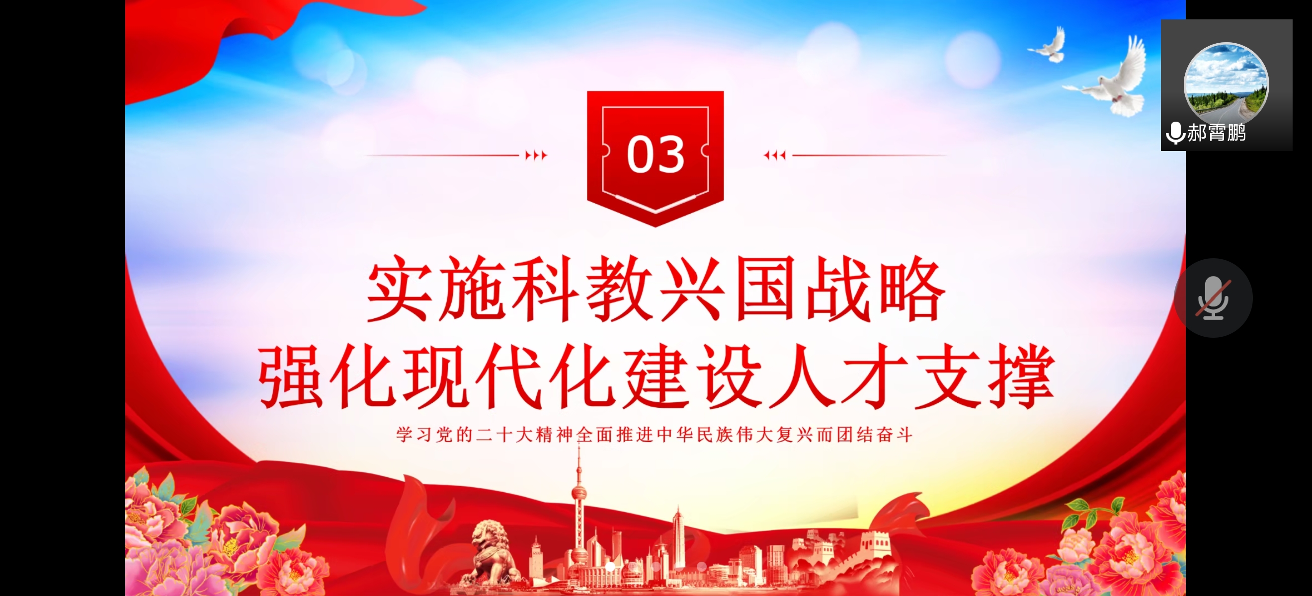 郝霄鹏从四个方面解读二十大报告提出的新观点、新战略和新要求:一过去五年的工作和新时代十年的伟大变革;二新时代新征程中国共产党的使命任务;三实施科教兴国战略,强化现代化建设人才支撑;四坚定不移全面从严治党, 深入推进新时代党的建设新的伟大工程。
