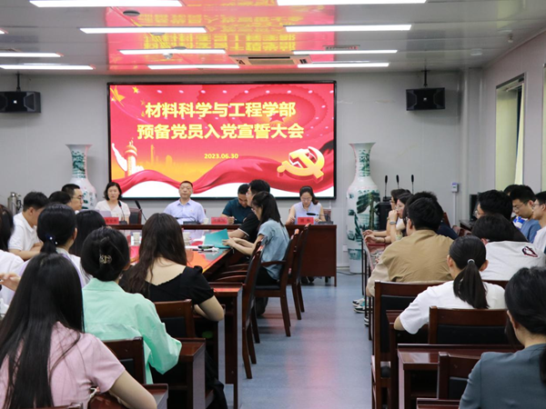 为热烈庆祝中国共产党成立102周年,深入推进学习贯彻习近平新时代中国特色社会主义思想主题教育,进一步加强对新党员的教育和培养,2023年6月30日下午,材料科学与工程学部在二号教学楼B204会议室召开预备党员入党宣誓仪式。材料学部党委书记刘永德、党委副书记池振国、团委书记姚彬、各学生党支部书记与学部全体党员共同参加本次仪式。仪式由学部组织员岳文芳主持。