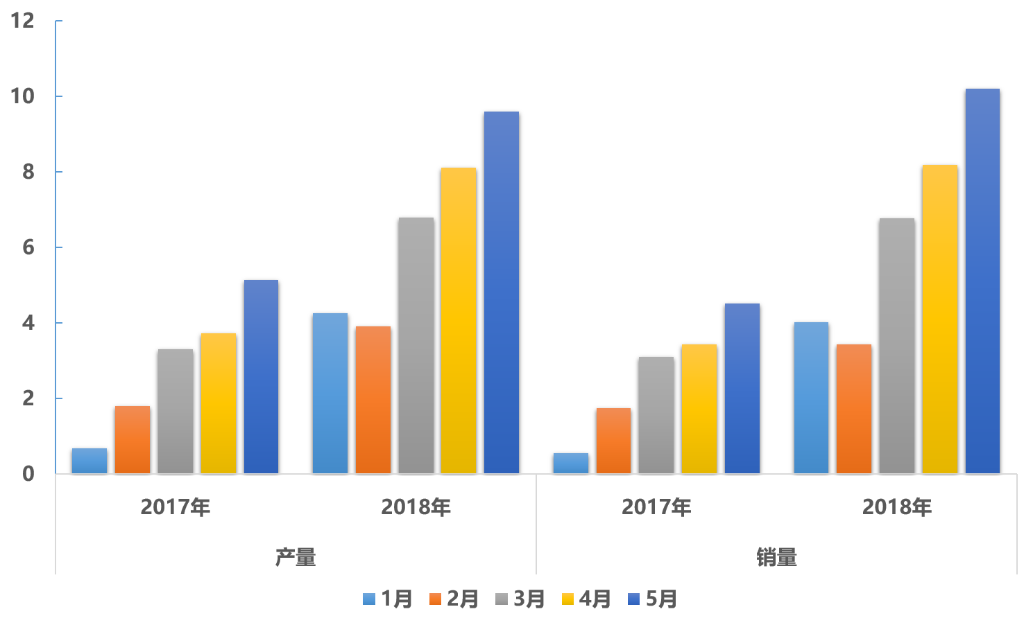而进入2018年,新能源汽车的产销量的增长势头依然高涨,2018年1-5月,新能源汽车产量销量分别达到32.7万辆和32.6万辆,比上年同期分别增长122.9%和141.6%。