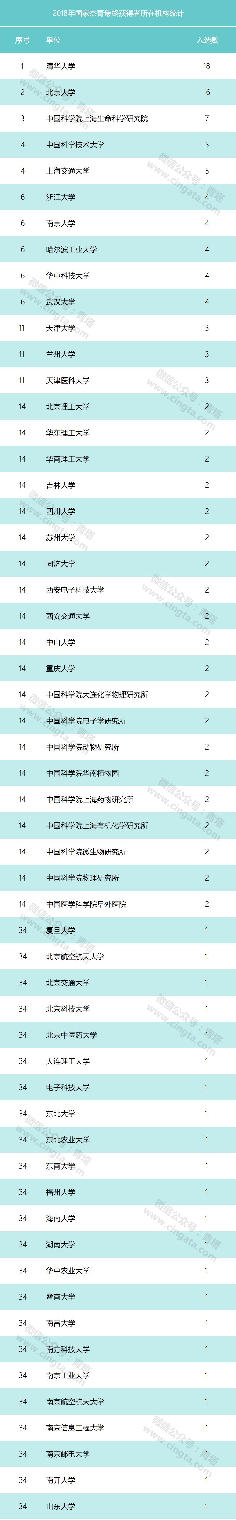 清华大学入选人数最多,达到18人。北京大学入选16人,紧随其后,清华和北大两所学校入选杰青占比超过了17%,远远多于其他高校。中国科学院上海生命科学研究院入选7人,中国科学技术大学和上海交通大学各入选5人。浙江大学、南京大学、哈尔滨工业大学、华中科技大学、武汉大学各有4人入选。其他高校入选数和科研机构少于4人。