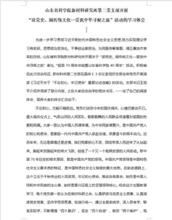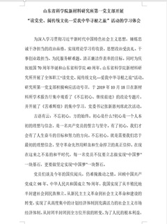 为深入学习贯彻习近平新时代中国特色社会主义思想,锤炼忠诚干净担当的政治品格,全所党员领导干部要牢牢把握“守初心、担使命,找差距、抓落实”的总要求,努力实现理论学习有收获、思想政治受洗礼、干事创业敢担当、为民服务解难题、清正廉洁作表率的目标。同时为庆祝祖国70周年华诞和山东省科学院40周年,我所开展了全体职工“读党史、阅传统文化—爱我中华寻根之旅”活动。