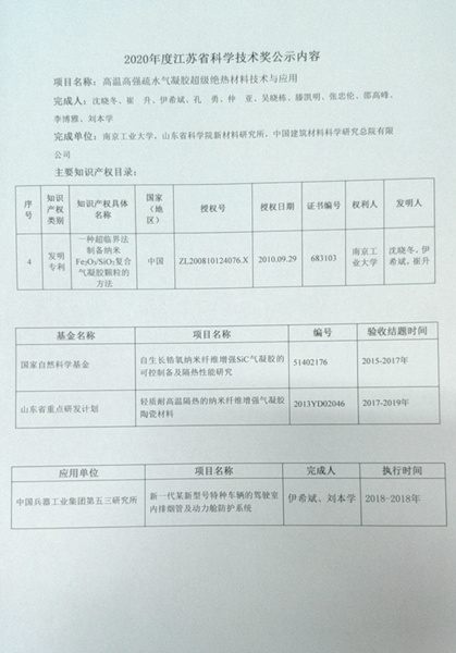 我单位伊希斌、刘本学参与申报2020年度江苏省科学技术奖项目“高温高强疏水气凝胶超级绝热材料技术与应用”。根据《省科技厅关于2020年度江苏省科学技术奖提名工作的通知》(苏科成发〔2020〕99号文件)要求,现将报奖信息予以公示,公示内容见附件。公示期为:2020年5月9日至5月15日。