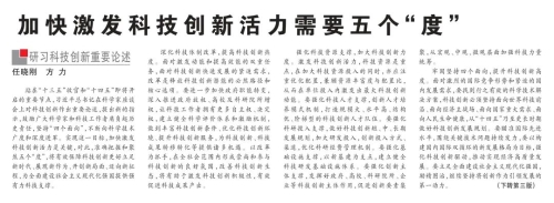站在“十三五”收官和“十四五”即将开启的重要节点,习近平总书记在科学家座谈会上对科技创新作出重要论述,提出新的指示,鼓励广大科学家和科技工作者肩负起历史责任,坚持“四个面向”,不断向科学技术广度和深度进军。实现这一目标,加快激发科技创新活力是关键,对此,准确把握和聚焦五个“度”,将有效保障科技创新更好立足新时代、展现新作为、开创新局面、迈向新征程,为全面建设社会主义现代化强国提供强有力科技支撑。 深化科技体制改革,提高科技创新热度。