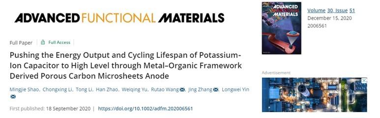 近日,新材料所气凝胶材料创新团队张晶副研究员与山东大学材料科学与工程学院王儒涛教授团队合作,在国际顶级期刊《Advanced Functional Materials》(中科院一区Top期刊,影响因子为16.836)上发表了题为“Pushing the Energy Output and Cycling Lifespan of Potassium-Ion Capacitor to High Level through Metal-Organic Framework Derived Porous Carbon Microsheets Anode”的最新研究成果。新材料所作为共同通讯单位,张晶副研究员及山东大学王儒涛教授、尹龙卫教授为该论文的共同通讯作者。该期刊是德国Wiley出版社旗下顶级期刊,在材料化学领域具有权威影响力。全文网址:http://h-s.doi.org.qlu.vpn358.com/10.1002/adfm.202006561。