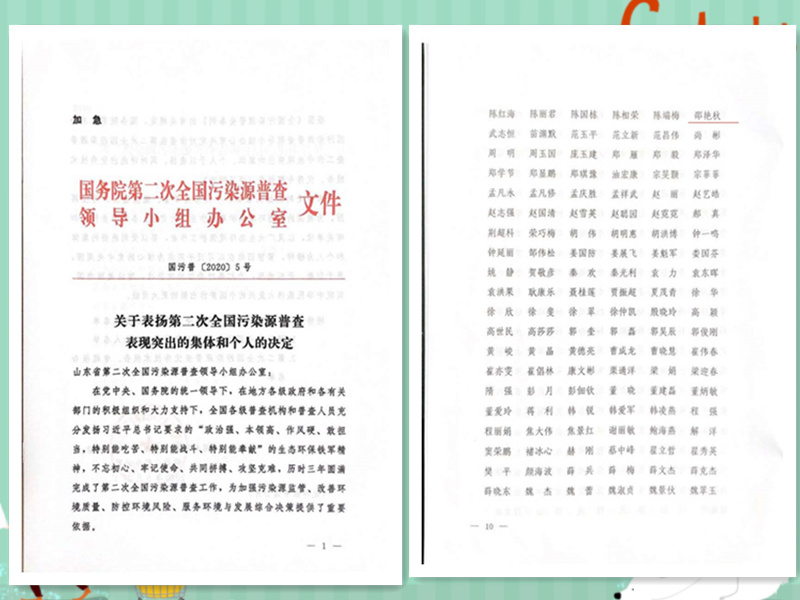 国务院第二次全国污染源普查领导小组办公室对在普查工作表现突出的集体和个人进行了表彰,新材料所邵艳秋博士获得国务院“第二次全国污染源普查表现突出个人”称号。山东省第二次全国污染源普查领导小组办公室对在山东省第二次全国污染源普查工作表现突出的集体和个人进行了表彰,项目组成员邵莹莹获得“山东省第二次全国污染源普查表现突出的个人”称号;同时,由我所朱英、邵莹莹、邵艳秋、王玉番、杨轲参与编制的《滨州市第二次全国污染源普查技术报告》获得“山东省第二次全国污染源普查市级优秀技术报告三等奖”。