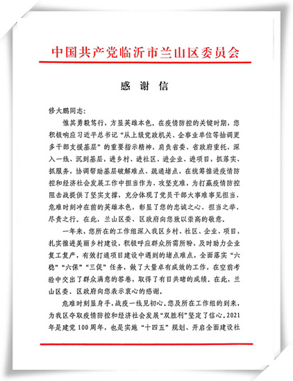 近日,新材料所挂职干部修大鹏收到临沂市兰山区区委、区政府的感谢信,对修大鹏同志在统筹推进兰山区疫情防控和经济社会发展工作中彰显的担当作为及攻坚克难精神,致以崇高的敬意和衷心的感谢。