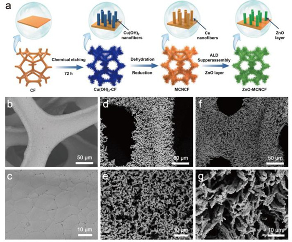 另一篇以“Atomic Layer Deposition Assisted Superassembly of Ultrathin ZnO Layer Decorated Hierarchical Cu Foam for Stable Lithium Metal Anode”为题发表在国际材料类顶级期刊《Energy Storage Materials》上。齐鲁工业大学(山东省科学院)为该工作的第一完成单位,2018级硕士研究生张润豪和李勇博士为第一作者。研究表明,该复合金属锂负极与磷酸铁锂正极和高负载量的钴酸锂正极等直接装配为性能优异的锂离子全电池。其磷酸铁锂电池可在2.0 C倍率下稳定循环1000圈仍有85.2%的容量保持,而高负载量的钴酸锂全电池同样具有优异的性能,在2.0 C的电流密度下循环1000圈,容量保持78.6%。该工作制备的复合金属锂负极实现无枝晶、无“死锂”的循环容貌,进而获得在对称电池和全电池体系中优异的电化学性能,提升了储能系统系统的安全性。