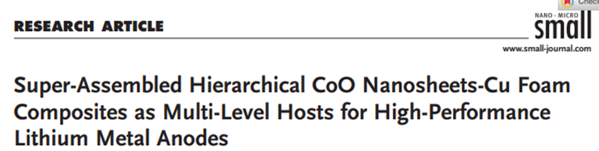 近日,我所先端材料基因组创新团队在材料科学国际顶级期刊《Small》(中科院一区TOP,影响因子11.459)上发表题为“Super-assembled hierarchical CoO nanosheets-Cu foam composites as multi-level hosts for high-performance lithium metal anodes”的最新研究论文。齐鲁工业大学(山东省科学院)为第一完成单位,硕士研究生张润豪为第一作者,指导导师李勇博士为共同第一作者兼通讯作者。