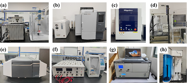 a)多通道电化学工作站与旋转环盘电极;b)在线气相色谱仪;c)X射线衍射仪;d)IGA智能气体吸附仪; e)紫外可见分光光度计;f恒电位仪;g)原位微分电化学质谱仪;h)气体吸附分析仪