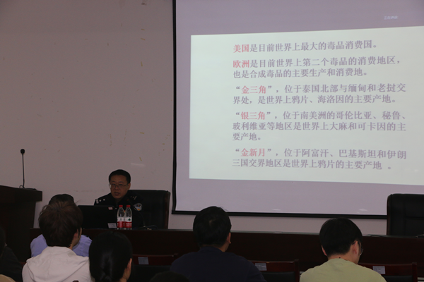 马廷华结合生动的案例和令人震惊的数字进行了现场授课,展现了禁毒工作的严峻形势。通过引用相关法律与规章制度,介绍了毒品的定义、分类以及常见的毒麻药品和制毒物品,让参会人员深刻体会到毒品就在我们身边,深受启发教育。