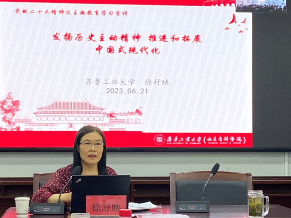 为深入推进学习贯彻习近平新时代中国特色社会主义思想主题教育,牢牢把握“学思想、强党性、重实践、建新功”的总要求,6月21日下午,材料科学与工程学部邀请马克思主义学院教授徐舒映在二号教学楼B204会议室开展了“发扬历史主动精神 推进和拓展中国式现代化”主题教育讲座。材料学部领导班子成员与全体教职工参加,千佛山校区教职工线上参加,讲座由学部党委书记刘永德主持。