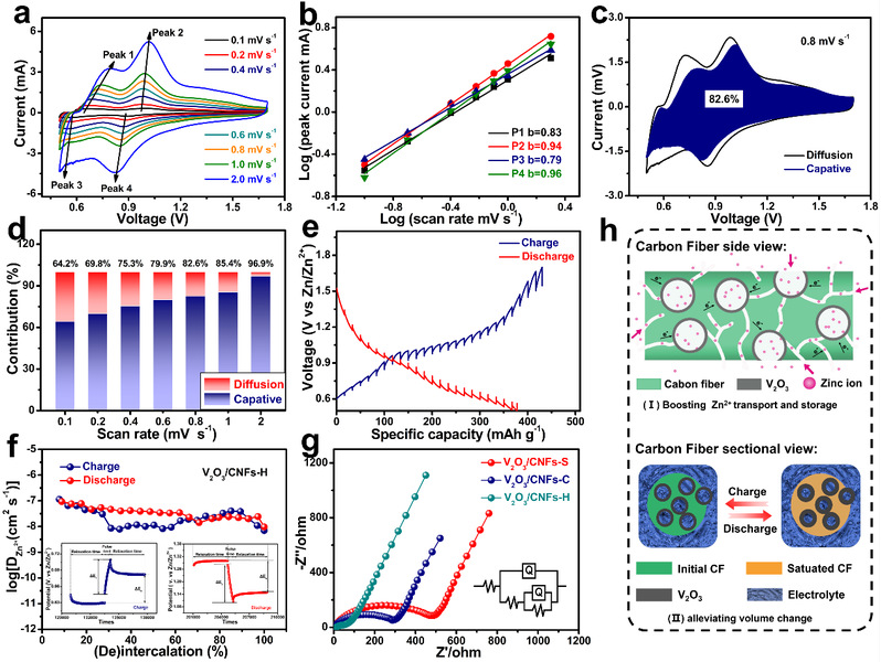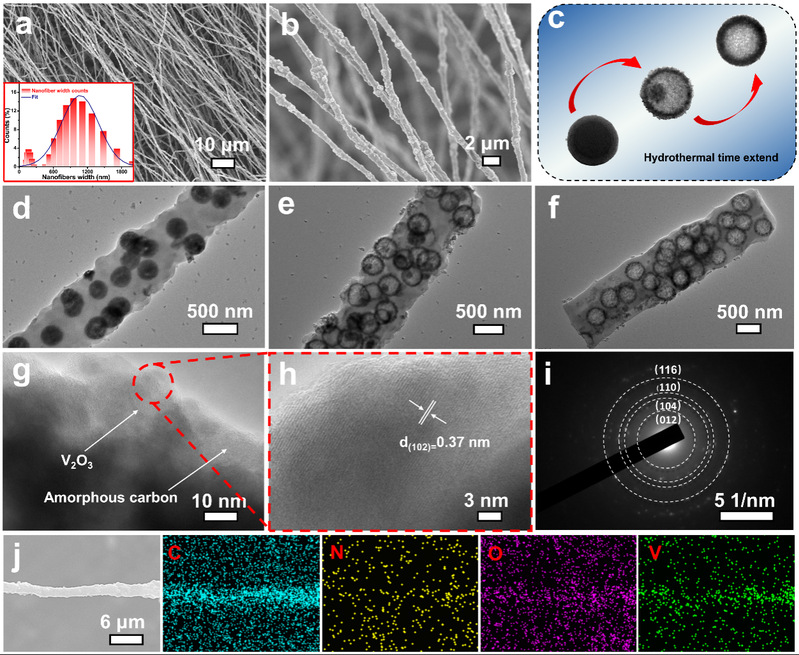 为了解决以上问题,齐鲁工业大学(山东省科学院)材料科学与工程学部先进高分子材料团队对钒基正极材料的结构进行了优化设计,采用静电纺丝技术首次合成了一系列V2O3纳米球实心、核壳、空心)包埋入N掺杂碳纳米纤维复合结构N掺杂碳纳米纤维不仅提高了电极的电导率和结构稳定性,还提供了封装外层以防止钒氧化物的溶解和颗粒的聚集。同时,通过电子顺磁共振谱等方法证明了该复合电极具有丰富的氧空位,结合第一性原理计算结果,氧空位能够有效降低材料的反应势垒,从而显著提高了Zn2+的反应活性。此外,循环中V2O3ZnXV2O5- nH2O之间的相变也通过非原位XRD得到了证实。得益于钒氧化物形貌调控以及丰富氧空位的双重作用,所得到的复合材料在纽扣电池中表现出优异的长期循环稳定性和良好的倍率性能,即使组装成柔性水系锌离子电池,复合电极仍然表现出优异的电化学性能,这可能为柔性水系锌离子电池正极材料提供新的设计理念。