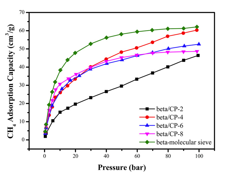 从图2可以看出加入适量的beta-分子筛后,使复合气凝胶的微孔体积增大,且均匀地分布在孔道结构的表面,使复合气凝胶形成分级多孔结构,并产生的微孔吸附和大/中孔传输的协同作用。复合气凝胶所增加的比表面积和微孔孔体积可为 CH4气体提供了更大的接触面积和储存空间,以确保更大的吸附能力。而存在的大/中孔可以充当气体通道,不仅能将CH4气体输送到微孔的界面,还可以扩散吸附过程中产生的热量来减少吸附阻力。