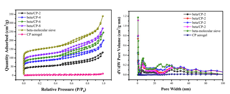 图2. CP气凝胶,beta-分子筛和beta/CP-N复合气凝胶(a)N2吸附-脱附等温线;