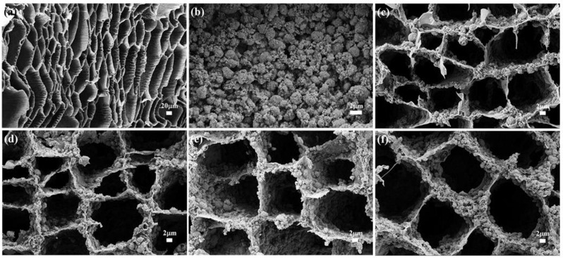 图1 (a) CP气凝胶;(b) beta-分子筛;(c) beta/CP-2; (d) beta/CP-4; (e) beta/CP-6 ;(f) beta/CP-8的SEM图