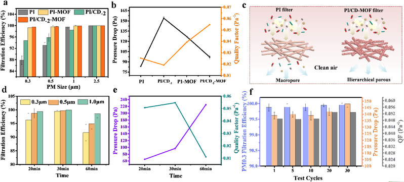 2滤膜(PIPI/CDPI-MOFPI/CD-2-MOF)(a) 对不同粒径颗粒物的过滤效率,(b)PM0.3的压降和质量因子QF变化关系;(c) PI滤膜和PI/CD-MOF滤滤膜的过滤机理;(d) PI/CD-2膜对PM0.3的过滤效率;(e)不同浸渍时间对压降和QF的影响;(f)双层空气过滤膜的长期过滤稳定性。