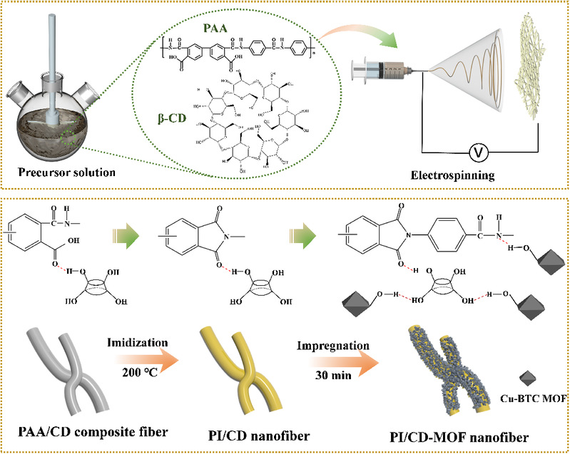 齐鲁工业大学(山东省科学院)材料科学与工程学部先端材料基因组创新团队采用静电纺丝技术和浸渍法制备了一种高效耐高温的多功能空气净化器材料。将β-CD嵌入到PI纤维中,利用强大的氢键作用力将Cu-MOF晶体组装在纤维表面,以构建层次化的多孔结构。含有酰胺键的二胺单体在PI骨架中共聚,以激活PI的表面惰性。利用β-环糊精(β-CD)作为PI纤维诱导剂,通过氢键作用实现Cu-MOF的自组装,这种依靠分子间作用力驱动材料自组装可提高纤维膜的力学性能。Cu-MOF的引入降低了PI纤维膜压降的同时,还可提高了PI滤膜对PMs的过滤效率。