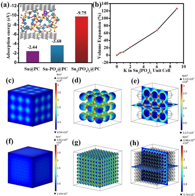 DFT计算和有限元计算表明,在该材料中,PO43-阴离子有利于提升钾离子的吸附和转移动力学,超结构形貌有利于Sn3(PO4)2@PC在体积膨胀后的应力分散,减小充电后材料的应力,缓解了体积膨胀造成的电极材料的粉碎、开裂甚至从集流体上脱落,有效提升其在充放电循环中的稳定性。这项工作采用超结构解决了平衡电池电极材料的纳米化和完整性的难题,并且提供了有效的合成方法,为高性能钾/钠电池的开发提供了新的思路。