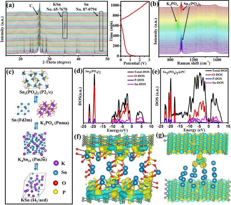 首先采用金属有机框架(MOF)晶体粒子作为构建超结构的体构建单元,通过煅烧超结构的MOF前驱体,制备衍生的Sn3(PO4)2@PC超结构。这样的结构提供了高的比容量和超长的循环稳定性(钾电中5 A g-1电流密度下比容量为144.0 mAh g-1,10000次循环后容量保持率为90.1%;钠电中5 A g-1电流密度下比容量为202.5 mAh g-1,8000次循环后容量保持率为96.0%)。同时作者采用原位xrd和原位拉曼,对Sn3(PO4)2@PC在钾离子电池充放电过程中的机理进行了研究。首次证实了Sn3(PO4)2@PC的储钾机理是典型的两步反应,即转化反应和合金化反应。