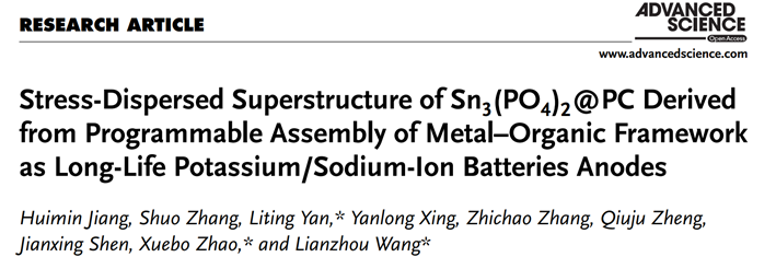 上述成果以“Stress-Dispersed Superstructure of Sn3(PO4)2@PC Derived from Programmable Assembly of Metal–Organic Framework as Long-Life Potassium/Sodium-Ion Batteries Anodes”为题,发表在国际知名期刊《Advanced Science》(IF: 15.1)上。齐鲁工业大学(山东省科学院)材料科学与工程学部联合培养博士研究生姜慧敏为文章的第一作者,材料学部闫理停副教授、赵学波教授和昆士兰大学王连洲教授为文章的共同通讯作者。