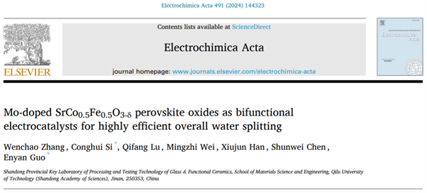 相关研究成果以“Mo-doped SrCo0.5Fe0.5O3-δ perovskite oxides as bifunctional electrocatalysts for highly efficient overall water splitting”为题在国际著名期刊《Electrochimica Acta》(IF6.6)上在线发表。齐鲁工业大学(山东省科学院)材料科学与工程学部2021级研究生张文超为第一作者,郭恩言副教授和司聪慧副教授为共同通讯作者。该研究得到国家自然科学基金山东省自然科学基金和济南市人才发展专项资金项目等的支持。