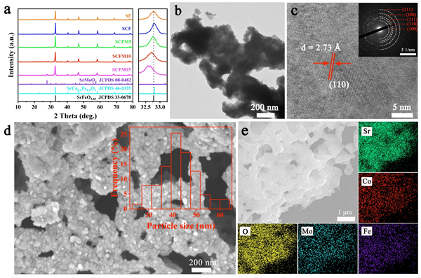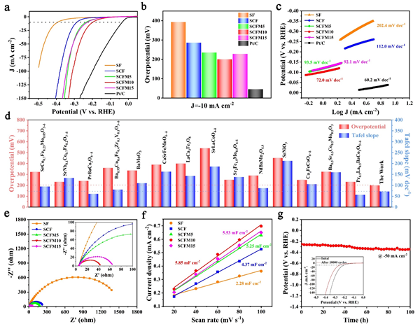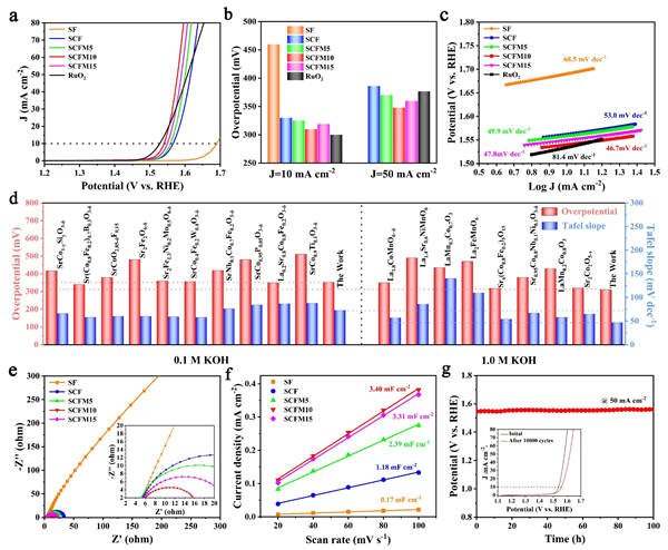 近日,齐鲁工业大学(山东省科学院)材料科学与工程学部先进材料计算与设计团队在钙钛矿氧化物电解水制氢方面取得了一定的研究进展。团队通过改良的溶胶-凝胶策略设计并制备了一系列B位掺杂的SrCo0.5Fe0.5-xMoxO3-δx=00.050.100.15)钙钛矿氧化物,通过调整Fe元素Mo元素的含量获得最佳的Mo掺杂比例结果表明,SrCo0.5Fe0.4Mo0.1O3-δ (SCFM10)表现出最佳的双功能水分解电催化活性,在-10 mA cm-210 mA cm-2HEROER过电位分别为~200 mV~310 mV,在双电极电解槽中仅需要1.68 V即可产生10 mA cm-2的电流密度与其他的金属氧化物相比,其展示出优异的HEROER活性。此外,SCFM10展示出出色的稳定性,可以连续工作100小时而不会出现明显的衰减。这项研究表明掺杂Mo元素是制备高效电解水钙钛矿氧化物催化剂的有效策略同时为开发双功能催化剂以实现高效、合理的电解水制氢提供了新的思路