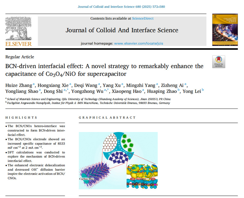 上述成果以“硼碳氮驱动异质界面:一种新式的显著提升超级电容器Co3O4/NiO电极比容量的方法”(“BCN-driven interfacial effect: A novel strategy to remarkably enhance the capacitance of Co3O4/NiO for supercapacitor”)为题发表在国际知名期刊《胶体与界面科学杂志》(Journal of Colloid and Interface Science)上。材料学部2022级硕士研究生张惠泽为文章的第一作者,吴拥中教授和史栋为共同通讯作者。本研究得到了山东省泰山学者工程、济南市人才发展专项、山东省自然科学基金等项目的支持。