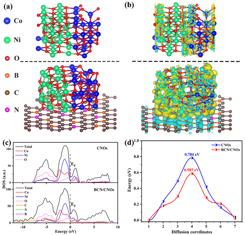 材料学部半导体材料与器件创新团队提出一种基于BCN辅助构建异质界面的全新策略用以提升过渡金属氧化物超电材料的比容量。如图1所示,BCN表面的缺陷位点与化学反应活性位点可以诱导高电活性过渡金属氧化物的生成,从而驱动异质界面的构建。图2展示的密度泛函理论结果揭示了在BCN/NiO/Co3O4异质界面处,强电负性BCN的引入导致NiO/Co3O4局部电子离域趋势增强以及NiO/Co3O4内部的离域电子向异质界面处转移并积聚,金属离子的氧化态的增强激活了NiO/Co3O4的电化学活性;异质界面处OH–扩散势垒的降低促进了金属氧化物的氧化还原反应,BCN/CNOs异质界面的构建成功将电极的比容量从3361 mF·cm–2显著提升至8533 mF·cm–2。该策略为超级电容器过渡金属氧化物电极比容量的提升提供了新的解决思路,在构建碳基复合金属氧化物材料异质界面方面提供了新的见解。