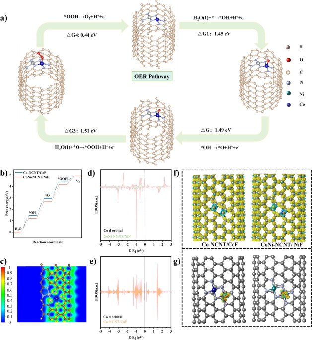 精确控制电极组成并在这些电极中构建均匀分布的活性位点仍然具有挑战性。在此,我们提出了一种通用策略,即利用金属有机框架(MOF)/镍箔可控合成自支撑Co-Ni/氮掺杂碳纳米管阵列(CoNi-NCNT/NiF)作为高效的OER电催化剂。实验和密度泛函理论(DFT)计算结果表明,Co纳米粒子的协同效应、杂原子掺杂和NCNTs的约束效应能够增强电子传输并加速电催化动力学。此外,CoNi-NCNT/NiF的多孔结构和优化成分将增强传质、电子转移及中间物吸附能力,所有这些因素共同作用使催化剂具有优异的电催化活性和稳定性。在碱性电解质中,CoNi-NCNT/NiF仅需268 mV的低且稳定的OER过电位即可在20 mA·cm?2电流密度下工作,表现优异,位居迄今为止报道的非贵金属催化剂前列。该研究为可持续清洁能源应用中的自支撑电催化剂的精确构建提供了新的指导。