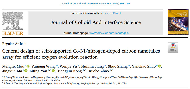 上述成果以“General design of self-supported Co-Ni/nitrogen-doped carbon nanotubes array for efficient oxygen evolution reaction”为题,发表在国际知名期刊《Journal of Colloid and Interface Science》(IF: 9.4)上。齐鲁工业大学(山东省科学院)材料科学与工程学部2022级硕士研究生牟梦菲为文章的第一作者,材料学部闫理停副教授、赵学波教授和潍坊大学孔祥军老师为文章的共同通讯作者。