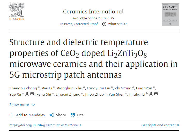 近日,材料科学与工程学部电子材料与元器件创新团队在陶瓷材料知名期刊《Ceramics International》上在线发表了题为“Structure and dielectric temperature properties of CeO2 doped Li2ZnTi3O8 microwave ceramics and their application in 5G microstrip patch antennas”的重要研究论文。材料学部2023级硕士研究生张正朴为文章的第一作者,徐越副教授为第一通讯作者,齐鲁工业大学(山东省科学院)为文章唯一单位。